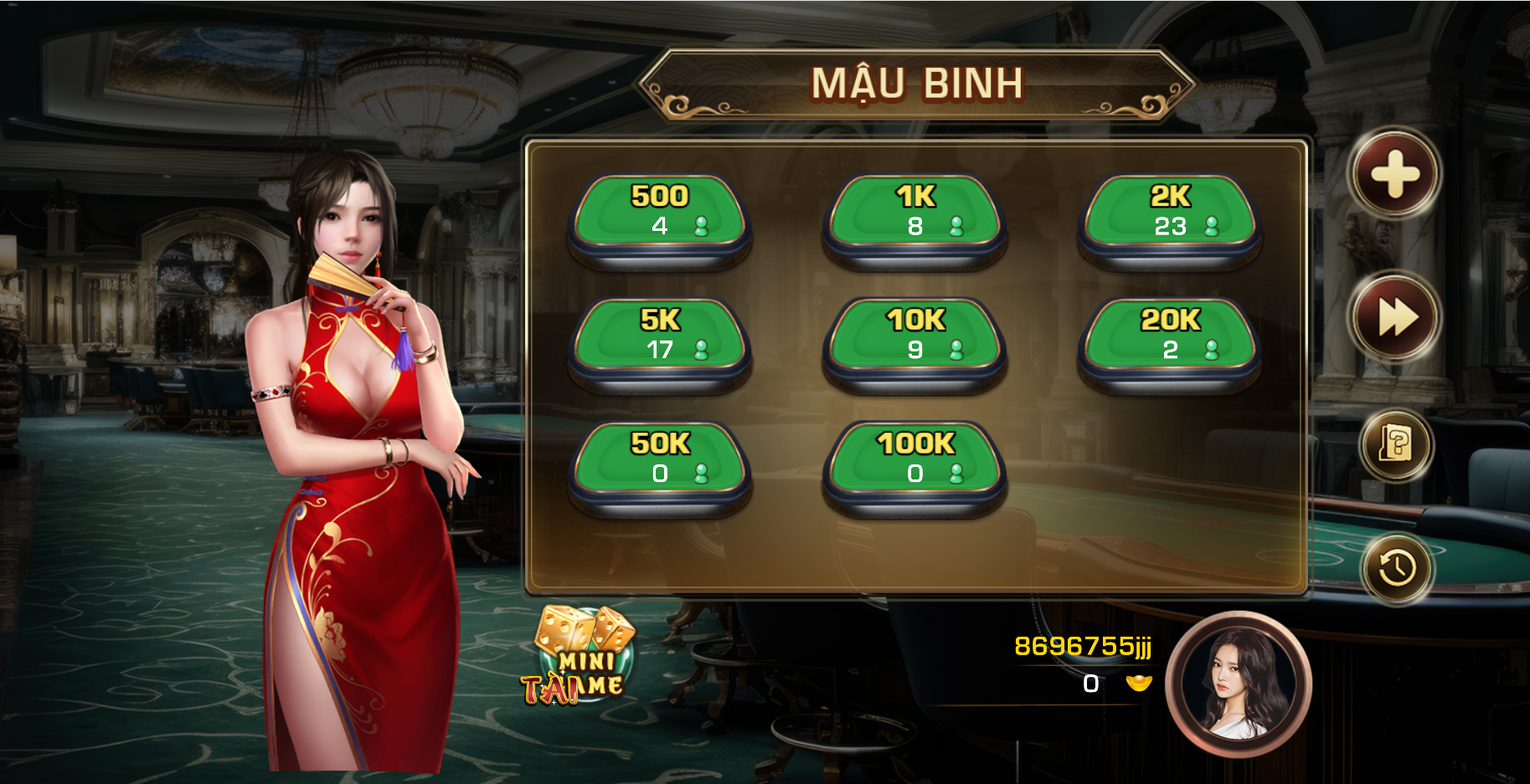 Mậu Binh (hay Binh Xập Xám) là game bài Lucky88 đòi hỏi kỹ năng sắp xếp bài và chiến thuật. Người chơi sẽ nhận được 13 lá bài và phải sắp xếp thành 3 bộ bài theo quy tắc nhất định. Phiên bản Mậu Binh tại Lucky88 có giao diện đẹp mắt, dễ sử dụng và nhiều tính năng hỗ trợ người chơi mới.